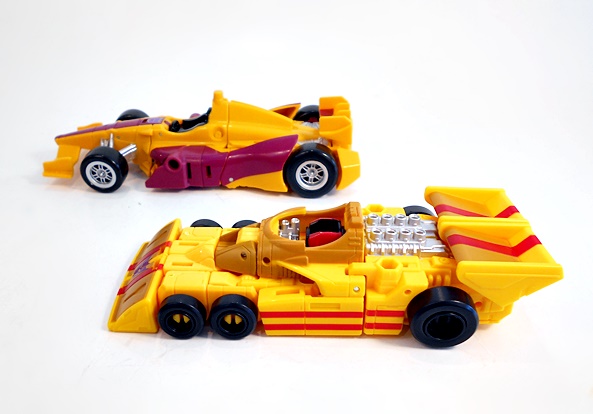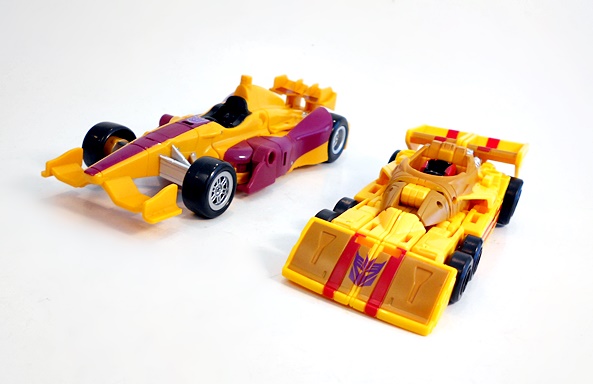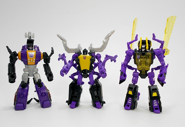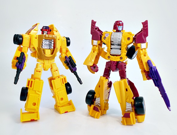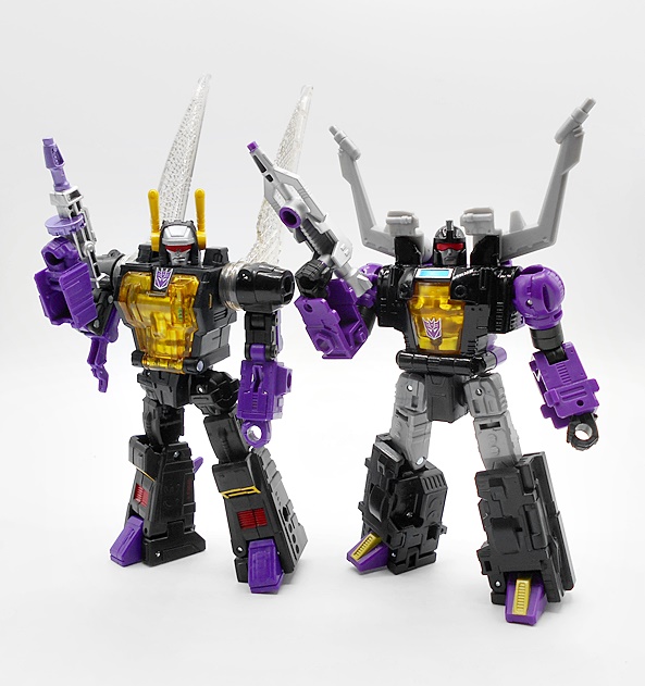 In addition to the twin guns, which I already showed plugged into his bug mode, Chop Shop also comes with a recolor of Shrapnel’s gun. None of these are a great fit for the G1 toy’s weapon, but once again, I’m OK with that. He also doesn’t come with a sword. I would have been fine with Hasbro tossing in recolors of the same sword mold for either, especially compared to what I’m going to look at next.