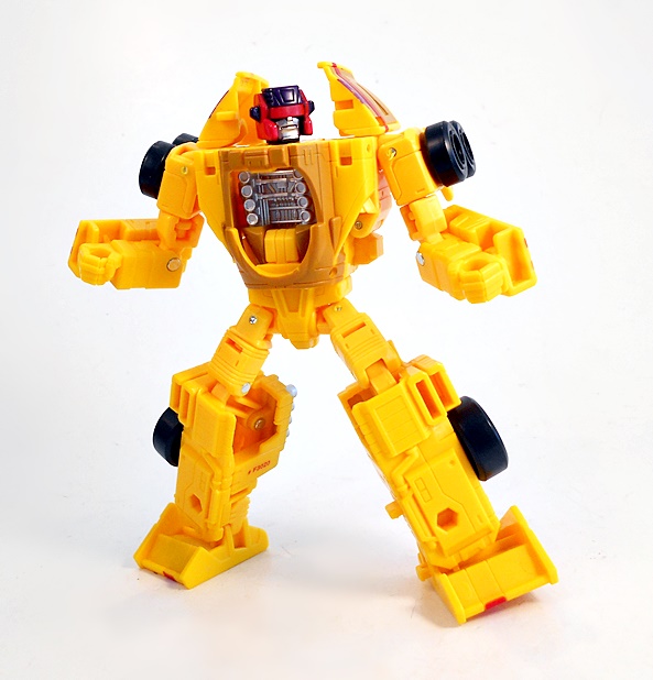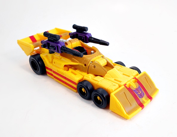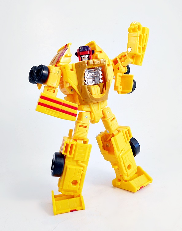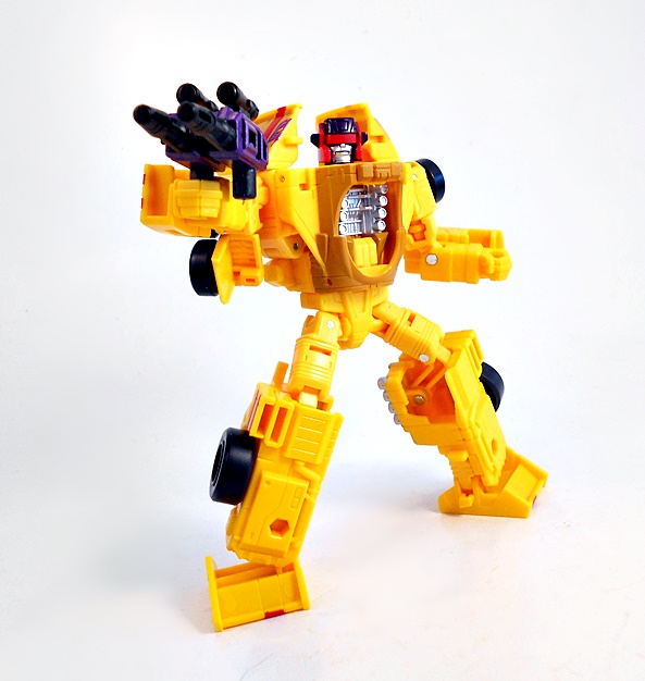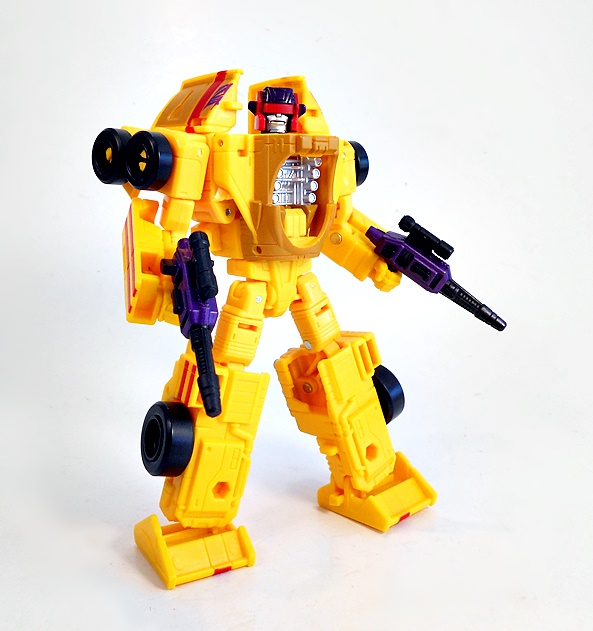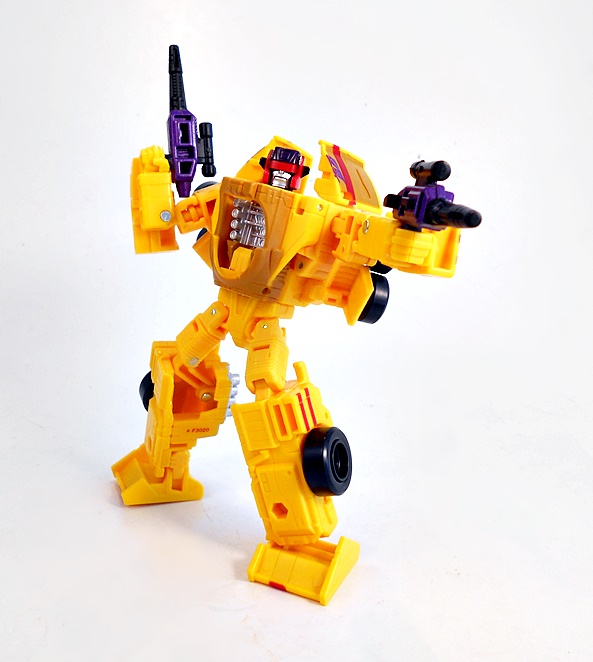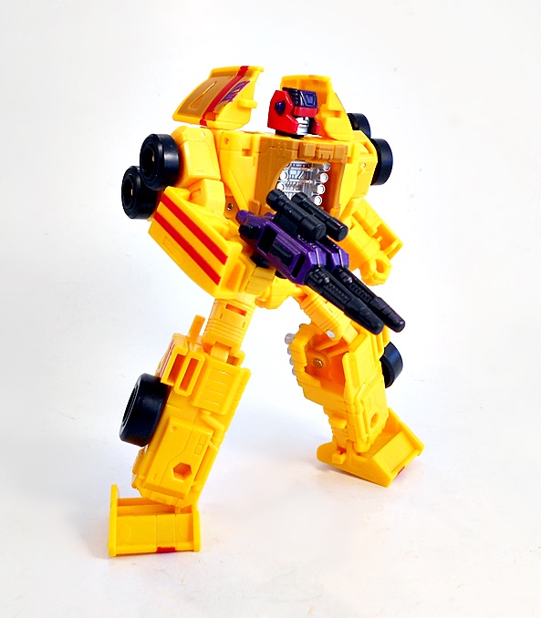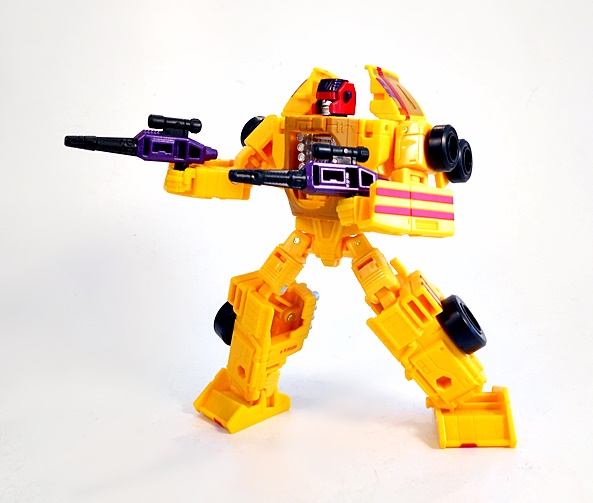 As I noted earlier, the weapon is a recolor of Bombshell’s, but we’ll still go ahead and call it his sonic rifle. The side pieces can come off and you can customize it a little bit. It’s not really a good match for the G1 figure’s weapon, but I’m not upset over that. I do wish he had come with a sword, like the original did. Lets’ move on to Chop Shop!