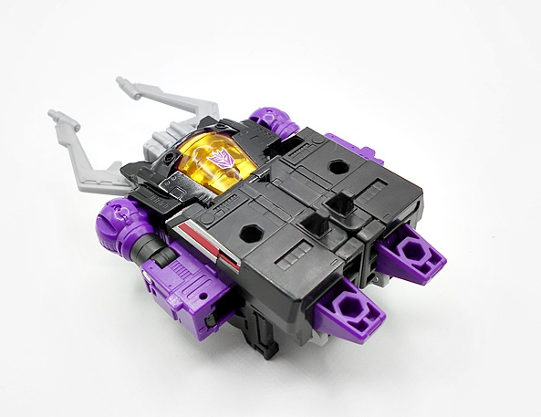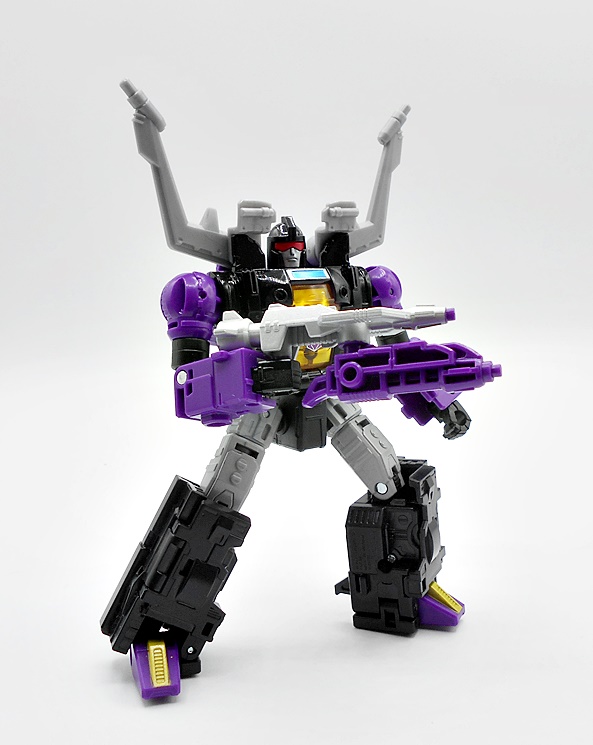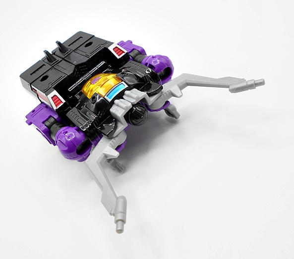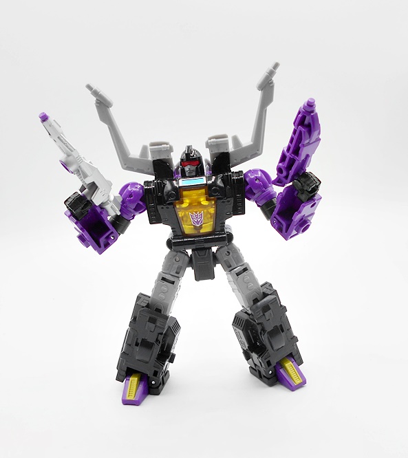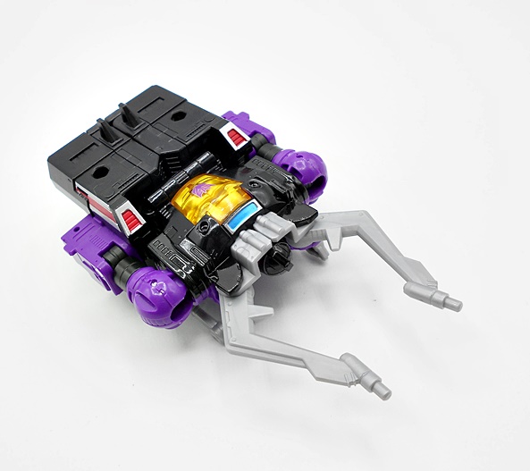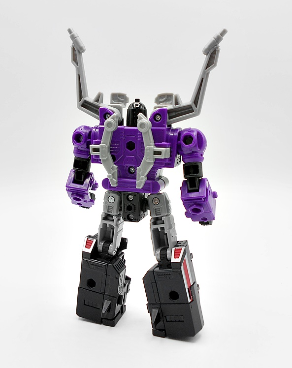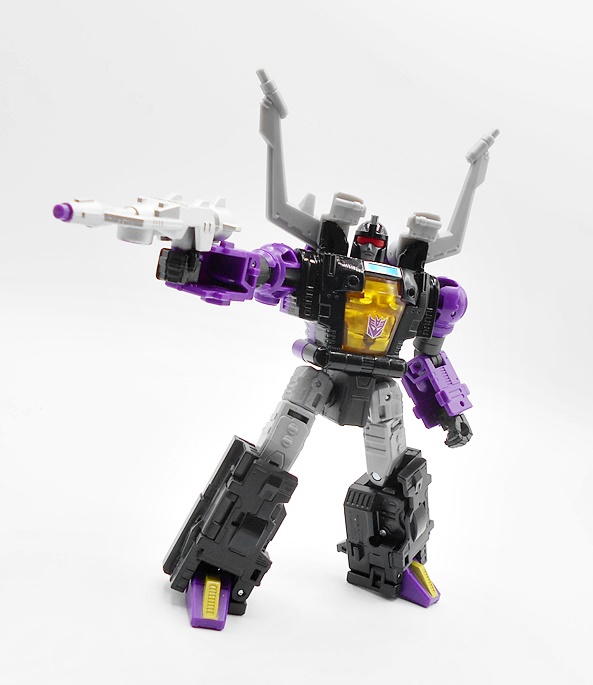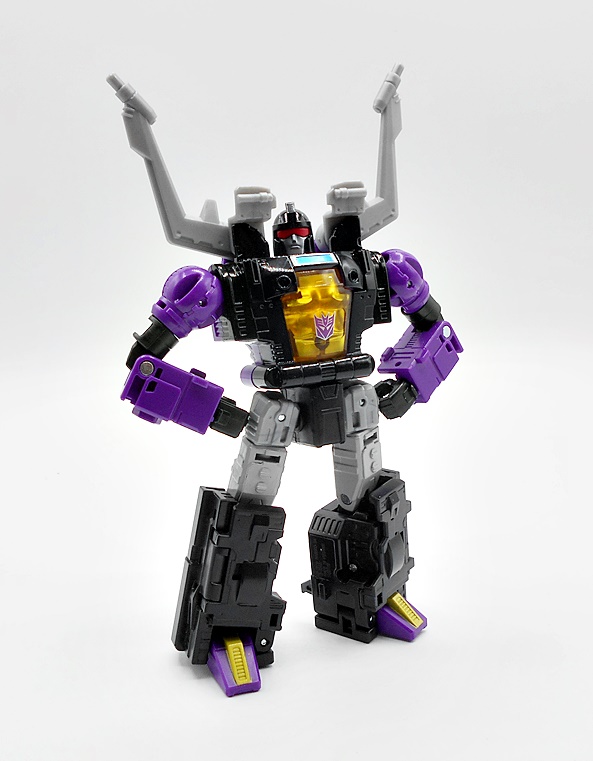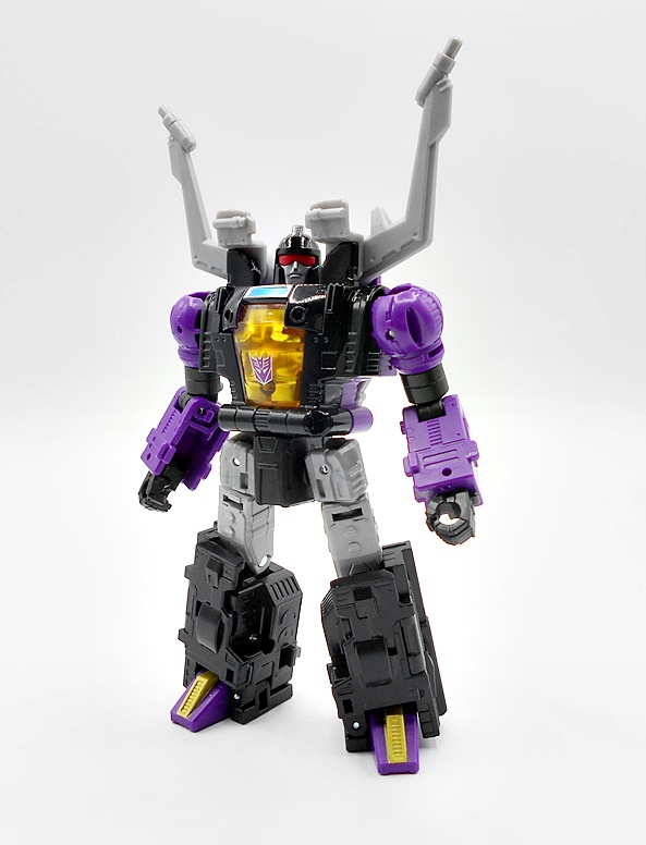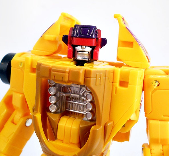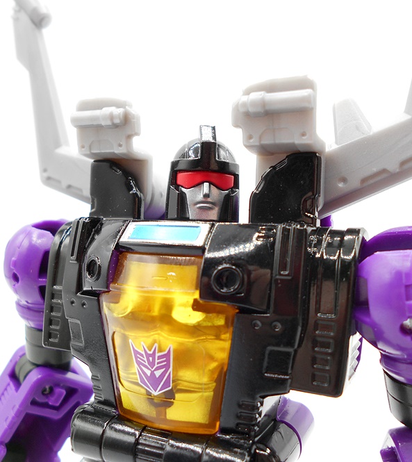 The new head is excellent, and a perfect update to the G1 toy. The rounded dome and angled red eyes give him a sinister visage. There’s some orange paint on his vocalizer box, as well as the twin antenna that sweep down to form open pipes on the sides of his cheeks.