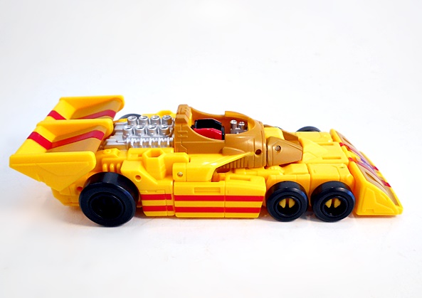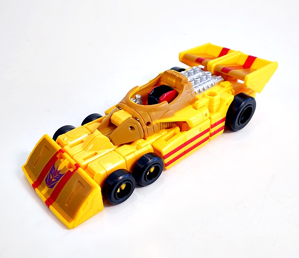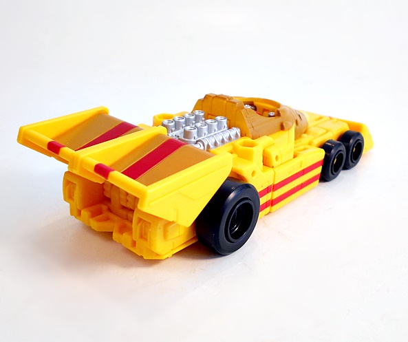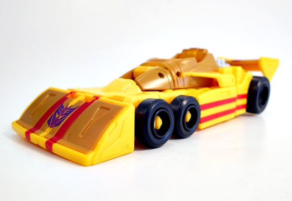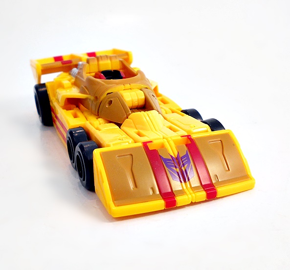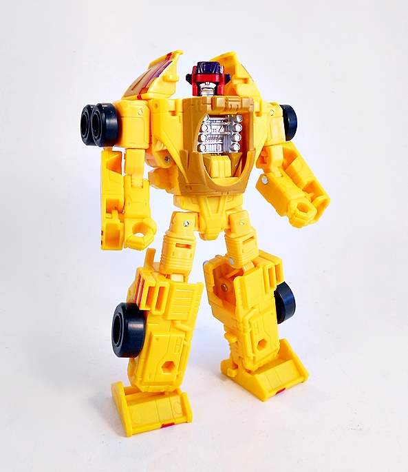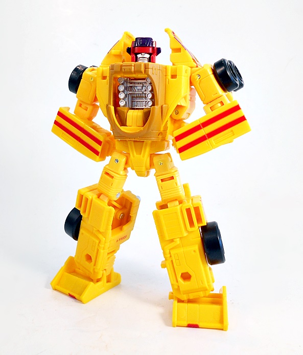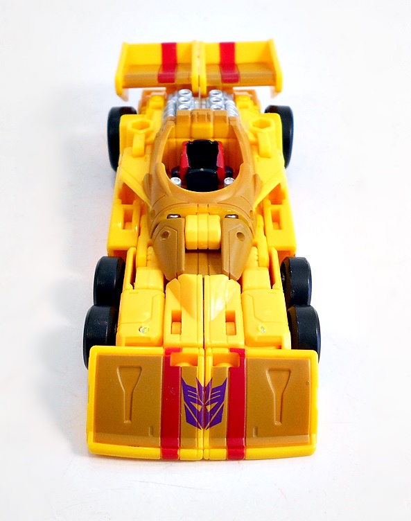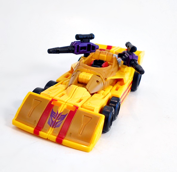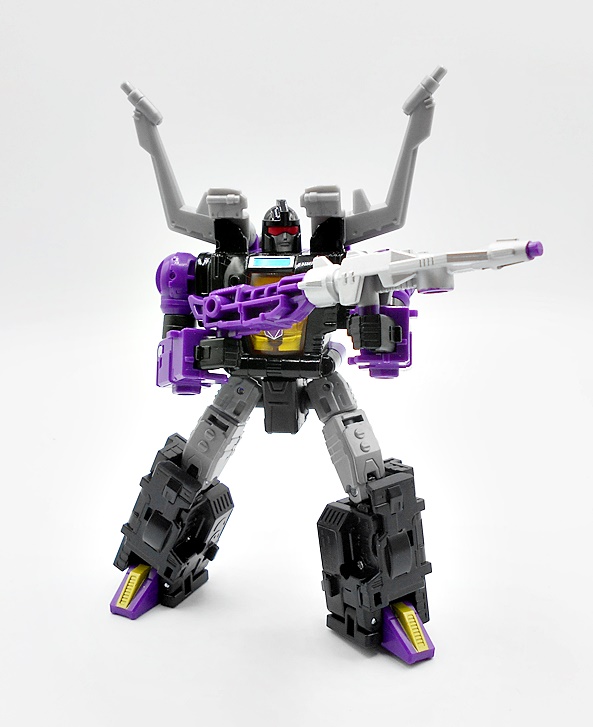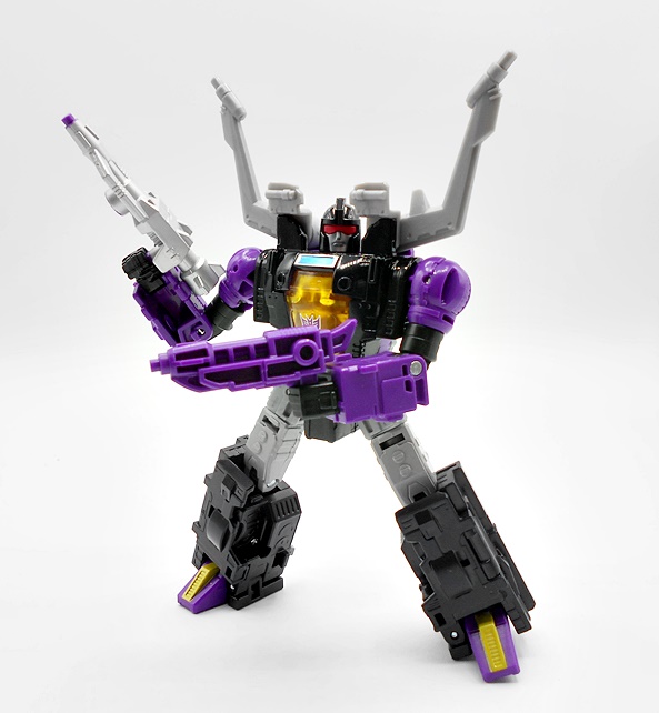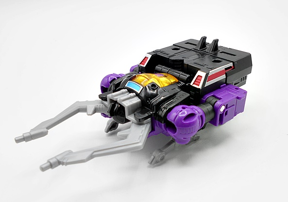 The new head is excellent, and a perfect update to the G1 toy. The rounded dome and angled red eyes give him a sinister visage. There’s some orange paint on his vocalizer box, as well as the twin antenna that sweep down to form open pipes on the sides of his cheeks.