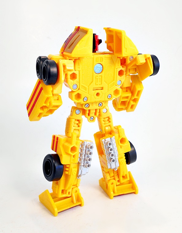 Transformation is very similar to what I’ve seen of Bombshell, but Barrage flips the chest to the back and uses the head horn to fill in the new chest, all while not jutting out as awkwardly far as the chest on the G1 Barrage. And all this sure goes a long way to make this robot mode look new and distinctive. The new bug legs can remain pegged into the arms, and I like to angle them back a bit to keep them out of the way. The coloring here remains pretty similar as the beetle, but now he’s showing more yellow. I dig the way the red bug eyes land just under his chest for an extra splash of color, and he has a Decepticon emblem square in the middle of his chest. The back fills out pretty well, but here’s where it’s really obvious that he’s a close cousin to Bombshell. Either way, this is an excellent homage to the original toy’s robot mode.