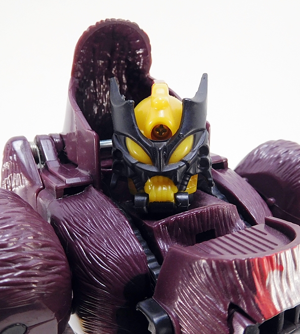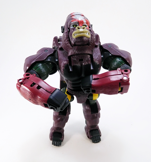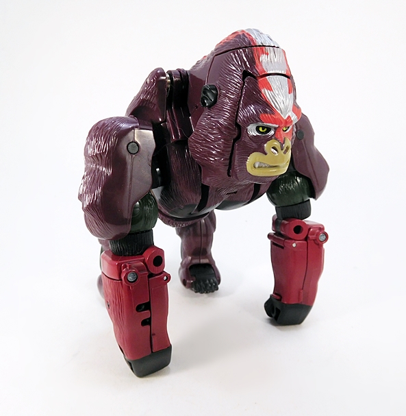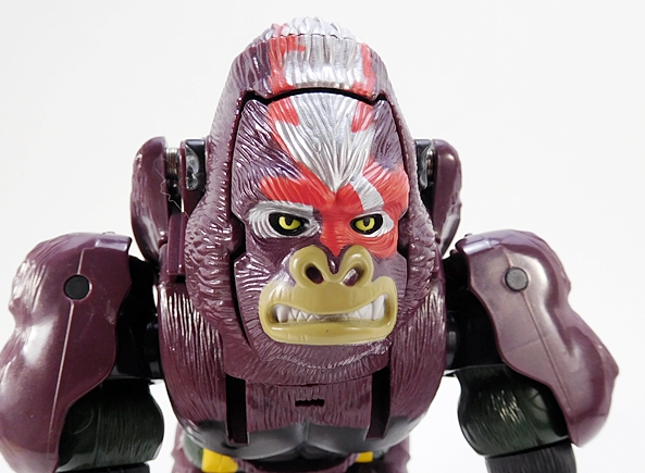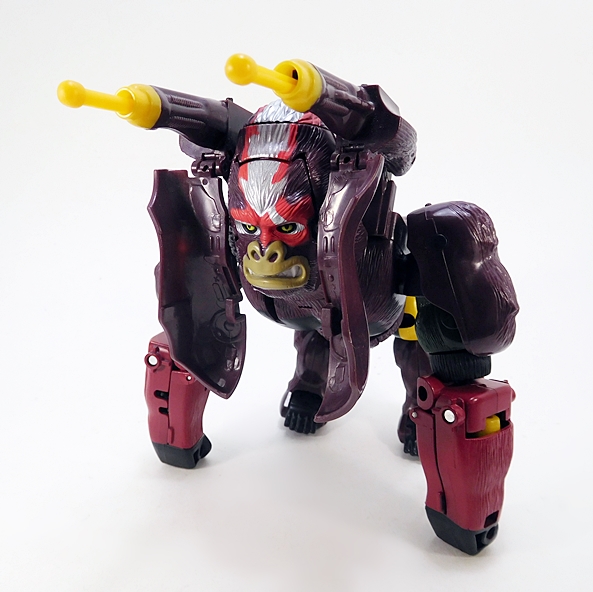 This is a complete recolor of the original toy, so even the plastic used for his gorilla body is different. Here it’s more of a chocolate brown, where as I believe the original was darker brown. You also get some green in the upper arms and upper legs. The gray and white parts from the original toy have been replaced, and I think all in all this deco looks quite good. There are some areas of exposed yellow plastic, but they’re not very prominent, at least not in the gorilla mode.