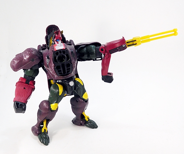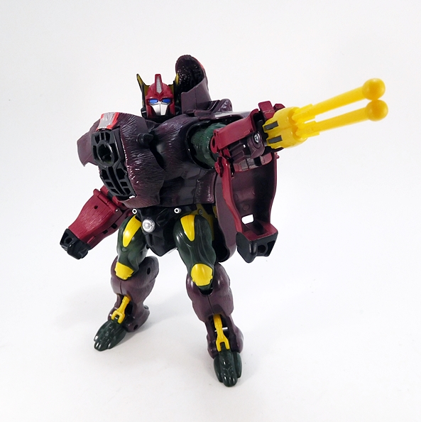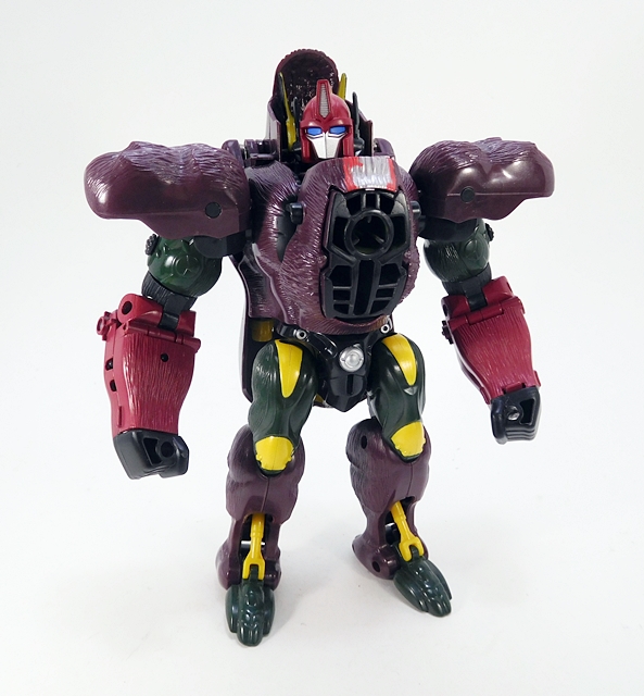 Because the beast mode and robot mode share the same limbs, transforming this guy is pretty simple and from memory, it’s pretty accurate to the transforming animation on the show. I really dig the robot mode here, which is pretty well proportioned and just looks like a powerful bot. The deco remains largely the same, although you do get some more yellow in the legs. I like the hydraulic arms that come out of the legs and attach to the feet, and the way the gorilla mode’s upper arms fold out into shoulder armor is pretty rad as well. The blending of robot with organic curves and sculpted fur certainly makes for a rather distinctive look that only Beast Wars could pull off. About the only thing here I’m not overly fond of is the rather ugly chest piece. It’s cool how the gorilla head flips inward, but they really needed a plate or something to cover that shit up.