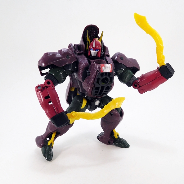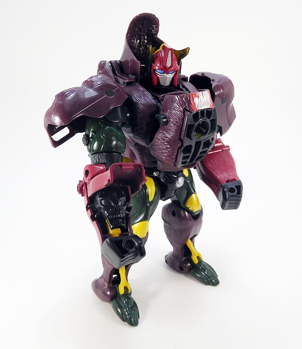 And here’s a really old picture of him in his box. Universe was a strange line, populated entirely by repaints of existing molds, sometimes introduced as new characters. The fiction for the line suggested that these were characters being pulled together from all ends of a Transformers Multiverse. In some cases it brought back toys that had been off the shelf for a while, like Primal here or the Machine Wars version of Starscream as King Atlas. It was a cool idea, and if Hasbro had stuck with using the older toys, it could have been something special. Unfortunately, it tended to favor repaints of a lot of recent releases, and as a result, I don’t think this line really reached its potential. Let’s start with Primal’s gorilla mode!