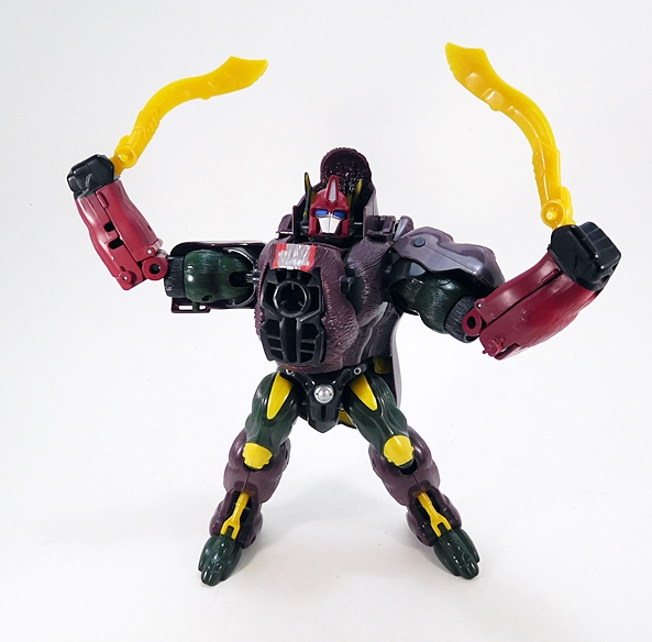 When it comes to Beast Wars, I was a big fan of the show but only dabbled in the toys. This is actually the first time I’ve owned this particular mold and I was pretty surprised by how much I liked the gorilla mode. Sure, it’s got lots of seams and exposed hinges, and stuff like that, but it’s still a decent looking and most of all fun toy. The sculpted fur is pretty well done and the face has a lot of personality, making Primal look like he’s about to put a Predacon’s head through the nearest wall.