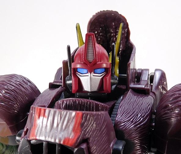 The head sculpt is not at all show accurate, but I do like it. It’s basically just a big-eyed Optimus Prime with a red “helmet” instead of a blue one. He has a rather exaggerated crest in the middle and his usual pair of ear headphones with antenna sticking up. The paint they used for the blue eyes looks great and manages to capture an illuminated look in the right light. The silver used for the mouth-plate is also quite striking. Of course, if you prefer your heroic Maximal leader to look like a goddamn monster… just flip the head around…