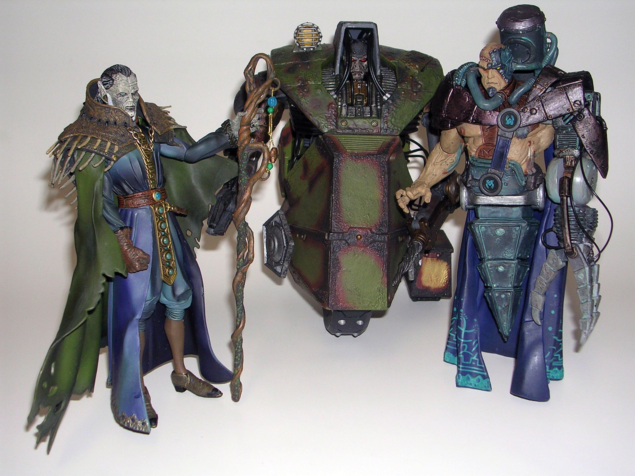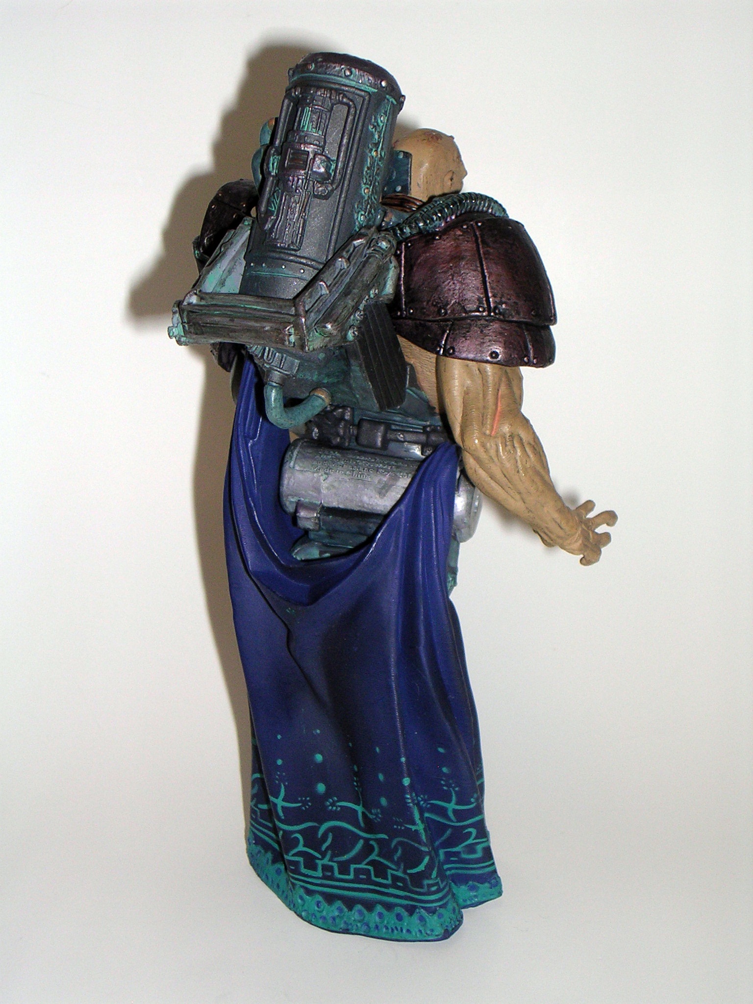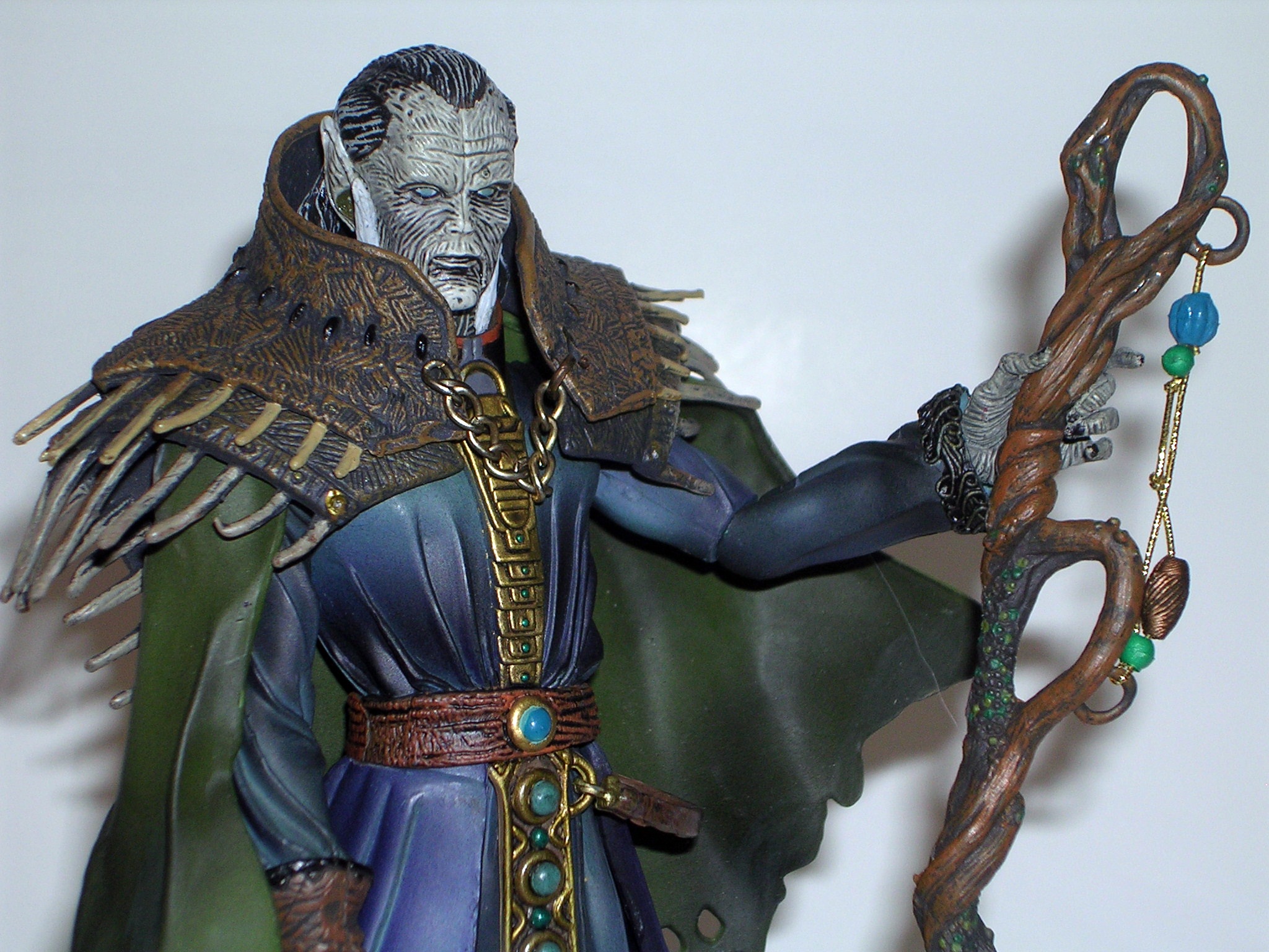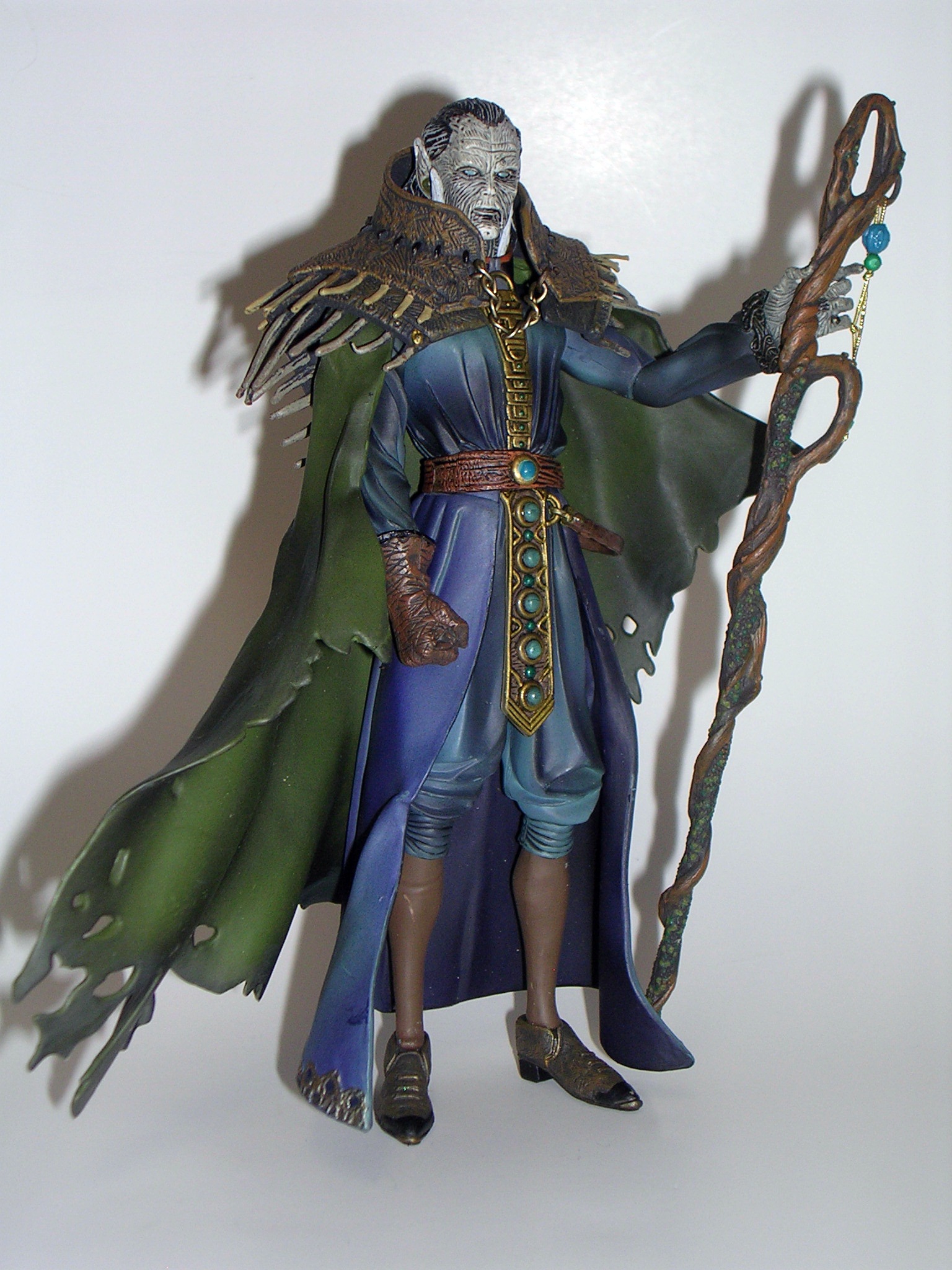 Either way, the character means nothing to me, but I really dig this figure. Unlike Blackthorne with all his steampunkery, Adranath looks like he’d be right at home in any fantasy setting. His face is wrinkled and puckered, like he’s been chilling out at the bottom of a lake for a couple of hundred years, but the rest of the figure is characterized by a magnificently sculpted lordly outfit. The detail work on his finery really blows my mind and it’s stuff like this that reminds me why I bought so many McFarlane figures back then in the first place. Just looking at all the sculpted detail on the back of his cape, right down to the tiny crosshatch texturing, impresses the hell out of me. He comes with a gnarled twisted wood staff, with gold string hanging some beads from it.