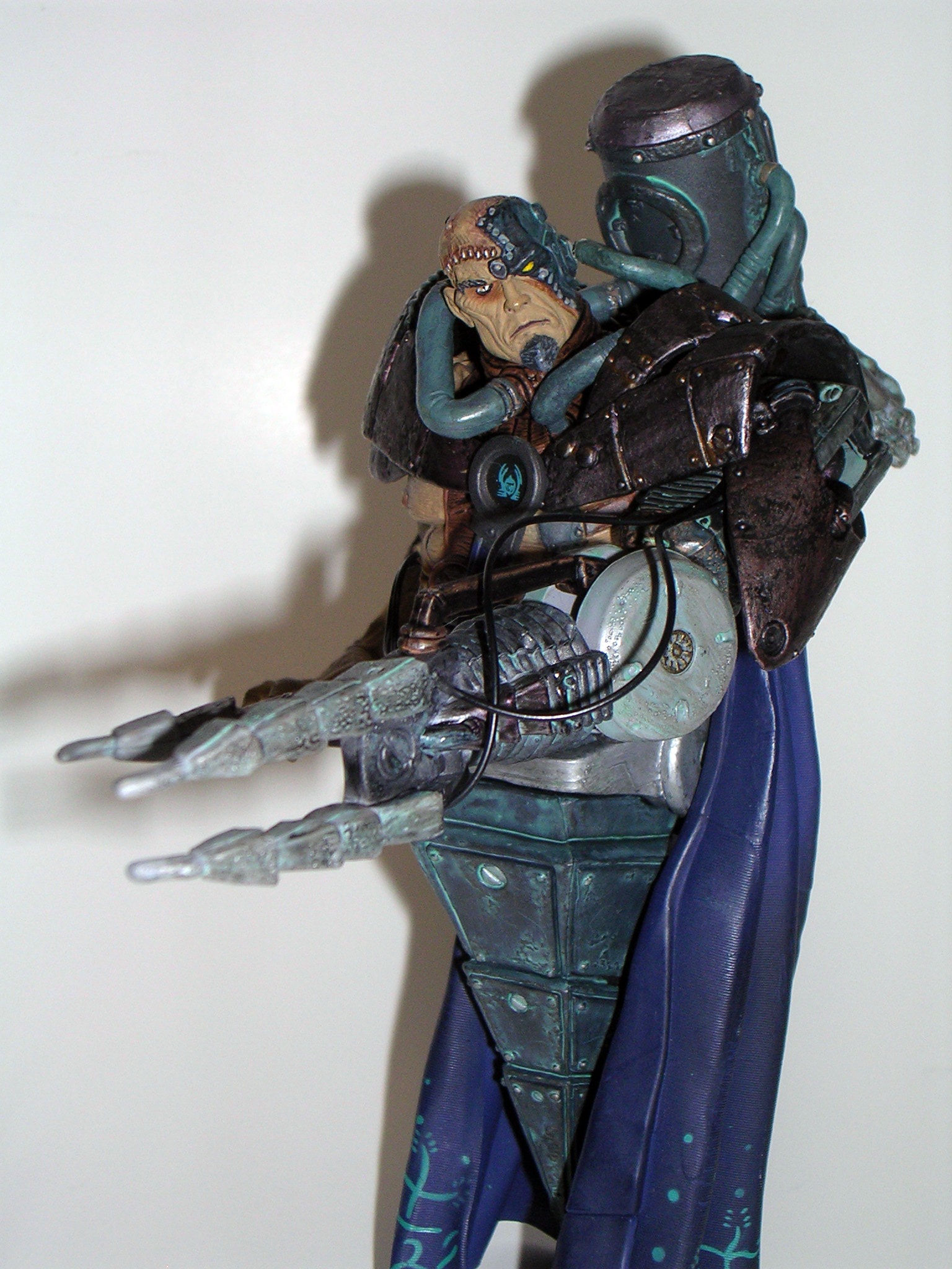 The sculpted detail and paintwork on Blackthorne is beyond impressive. The metal parts have all their sculpted rivets, screws, and panel lines. There are welding marks along the seams of the tank on his back and all the artificial bits have rough, hammered surfaces. Even the organic bits are beautifully recreated. He has veins in his arms, staples along a gash on his head and a grim expression. If you’re into nasty looking steampunk cyborg dudes, this is a guy that belongs in your collection.