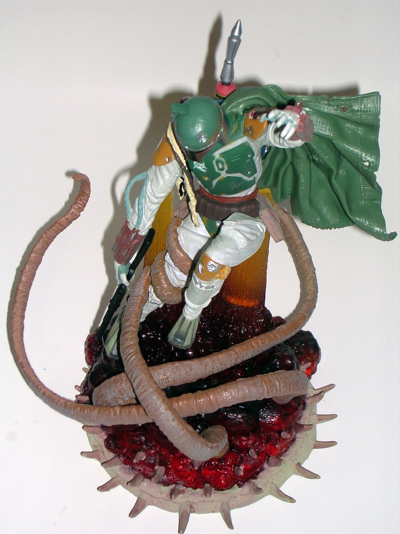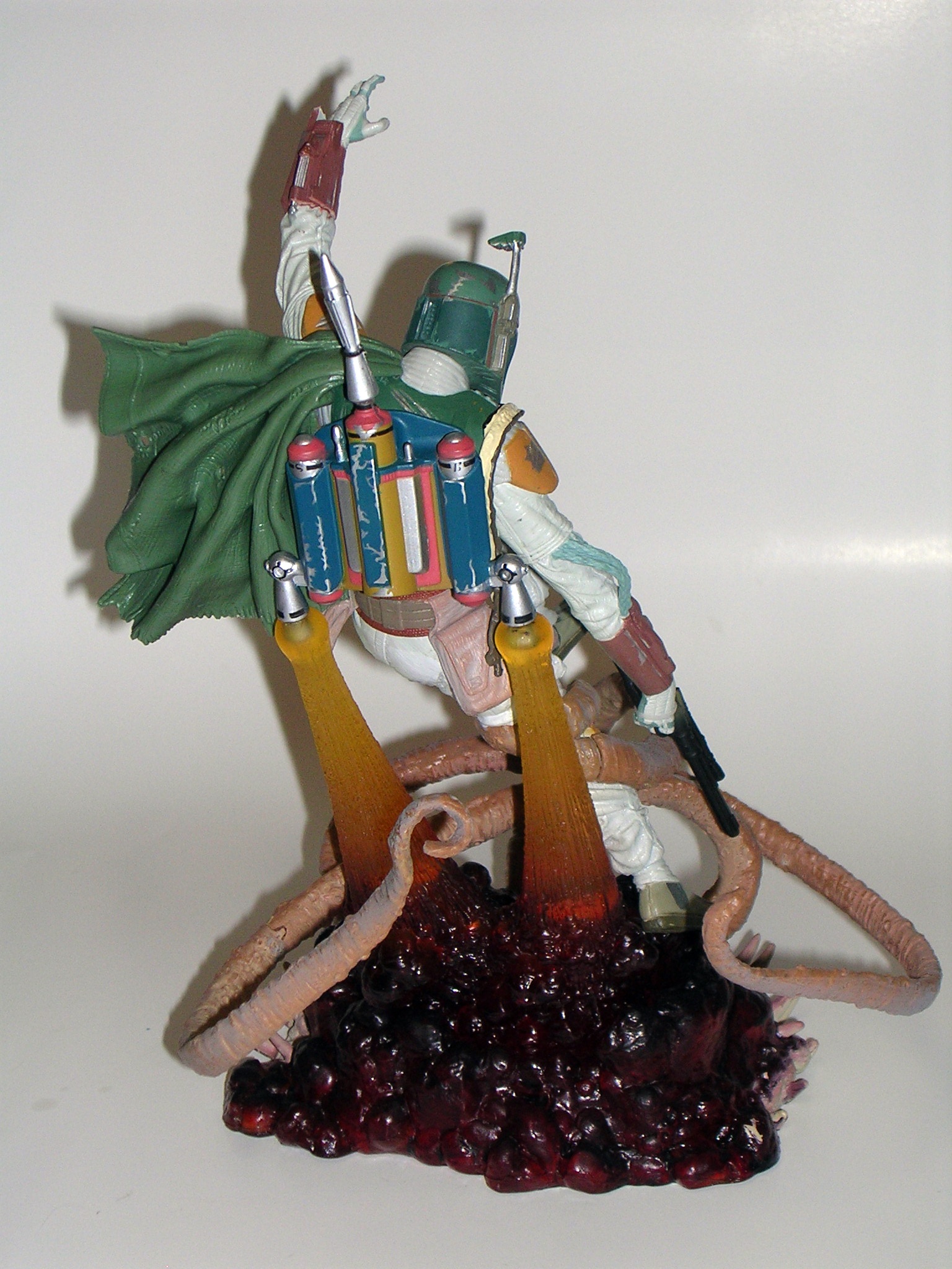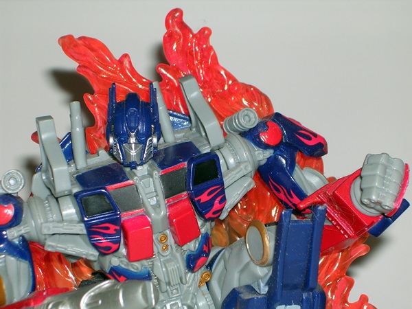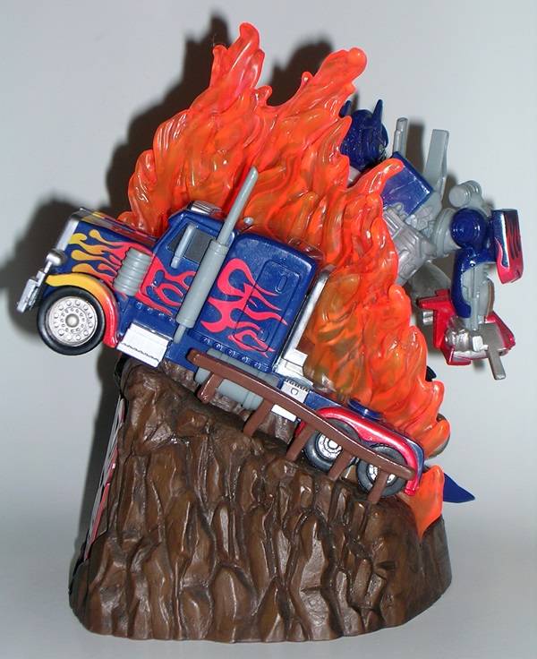 The alt mode portion of the statue depicts Prime in his movie truck form, launching himself off a cliff against a backdrop of terrible looking translucent plastic flames. The cliff looks like it’s carved out of chocolate and there’s a huge Autobot insignia sculpted into the side. Only part of the truck is actually here because it’s partly obscured in the so-called fire. I never minded Prime being an extended front cab, but I was never a fan of this coloring. There’s way too much blue, and this statue seems to add even more. Apart from that, there are some stray splotches of paint. All in all, this looks Ok, I guess, but it’s nothing spectacular. Maybe the flipside will be better?