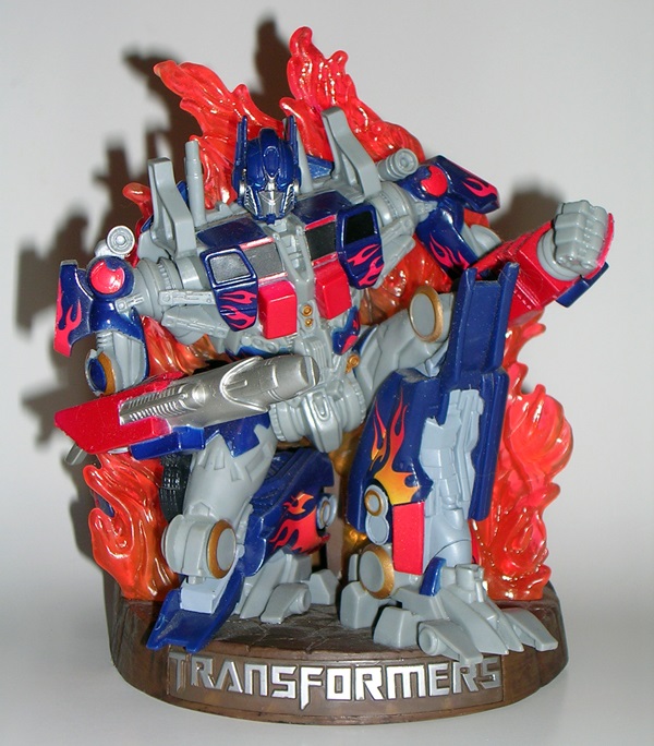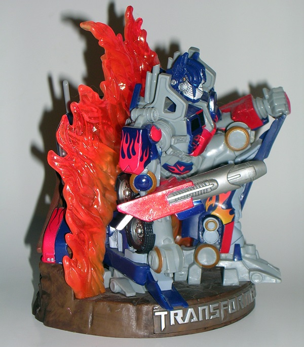 I don’t have the packaging for this wonderful object d’art any longer, but I seem to recall it coming in some sort of window box. I also need not confess to actually buying it, as it was a present from the former Mrs. FigureFan. I’m tempted to say it was well-intentioned, but unfortunately she turned out to be quite a vindictive headcase, so it could have just as easily been gifted out of spite. Anyway, the idea here is that in the true nature of the Transformers, this is actually two-Two-TWO statues in one! On one side, it’s Prime in his truck mode, but turn it around and there he is in his robot mode. You see? It’s like a Transfromer but it’s a statue!