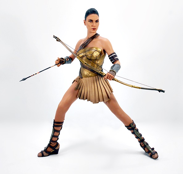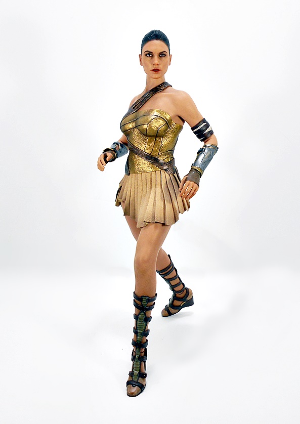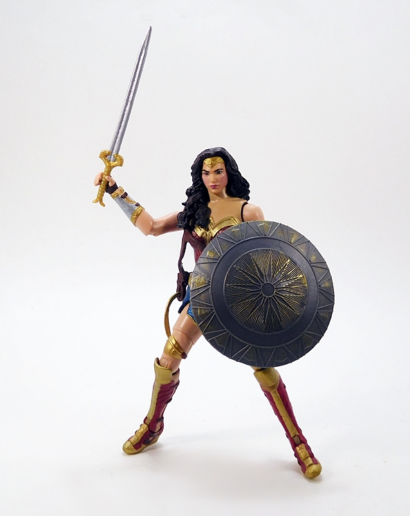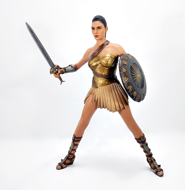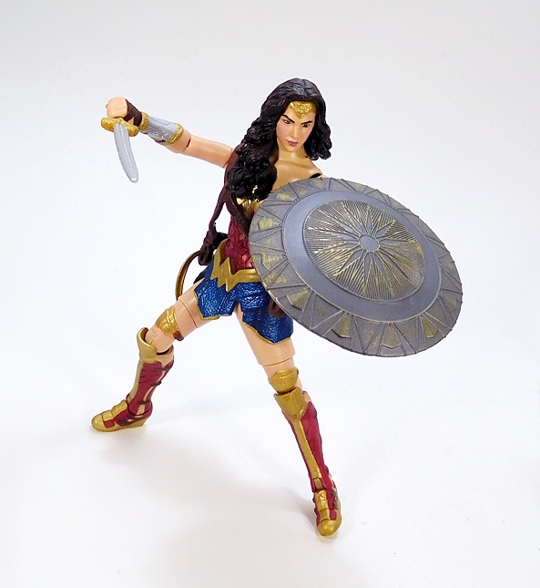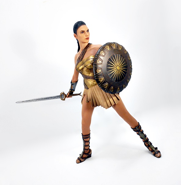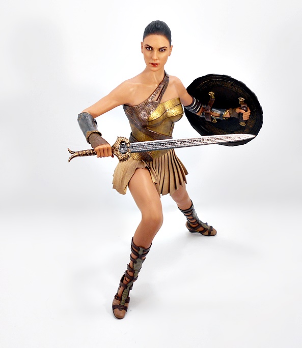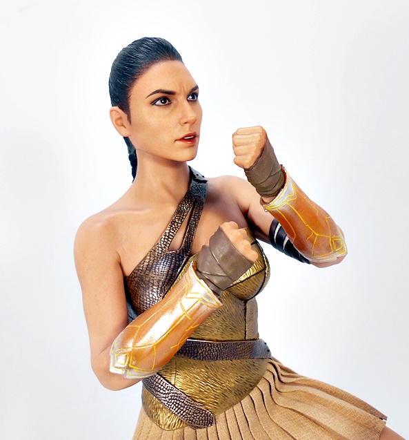 Oh yeah, that’s the stuff! As we saw with Catwoman, the composition is a little bit of museum pose with a hint of action. Wonder Woman stands with a slight lean to her right hip and a turn to her left ankle. Her coiled golden lasso is held firm in her right hand, while her left arm is drawn up to effortlessly deflect a projectile headed right for her face. Her one-piece outfit has a very modern vibe from the golden belt up, and things get a little more traditional below, with some abbreviated skirt flaps hanging down front and back.