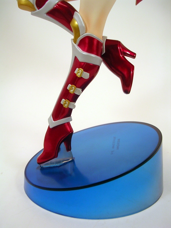 The sword features a rather ornate gold hilt with swirling patterns making up the guard. The stout blade is painted silver and has two fullers running down the center. The grip is extended, so she can wield it in one or both hands, and her articulation allows either option.