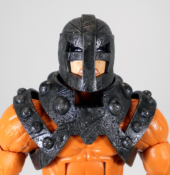 Bulldozer’s costume is comprised of bulky pieces reinforcing his orange jumpsuit. The sculpting on these pieces is really nice, complete with huge rivets and a lot of pitting and scratches to make them look weathered and used. The same techniques are used on his helmet. The head sculpt is pretty good, but it’s rather obvious that it’s all one piece. I think it would have been cool if they had layered the helmet onto the head to give it a little depth.