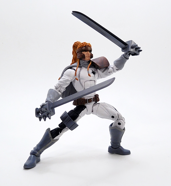 Shatterstar includes his distinctive swords, and I have always loved these things! They’re both cast in the same matte gray plastic. Some paint apps on the hilts would have been cool, but they still look fine. One features a twin blade and the other a single blade. Both have those kick-ass spiked knuckle guards.