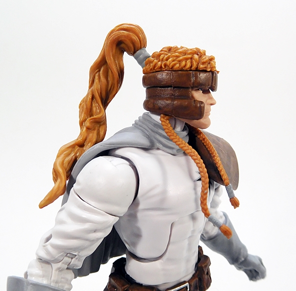And the portrait is no slouch either. The facial features are well designed, and he has the star tatt over his left eye. It’s a little tough to see the eyes when looking straight at him because that padded half-helmet sits low and casts a shadow over his peepers. Nonetheless, I love how the top-less helmet looks like it’s sculpted from an entirely separate piece. It matches the weathered leather look of the belt and shoulder pad, almost like an old timey rugby helmet. Also the hair looks great, complete with his trademark snaking ponytail and the twin braided pigtails that hang down the front, which must have been all the rage back on MojoWorld.