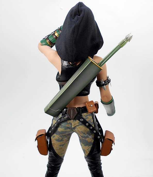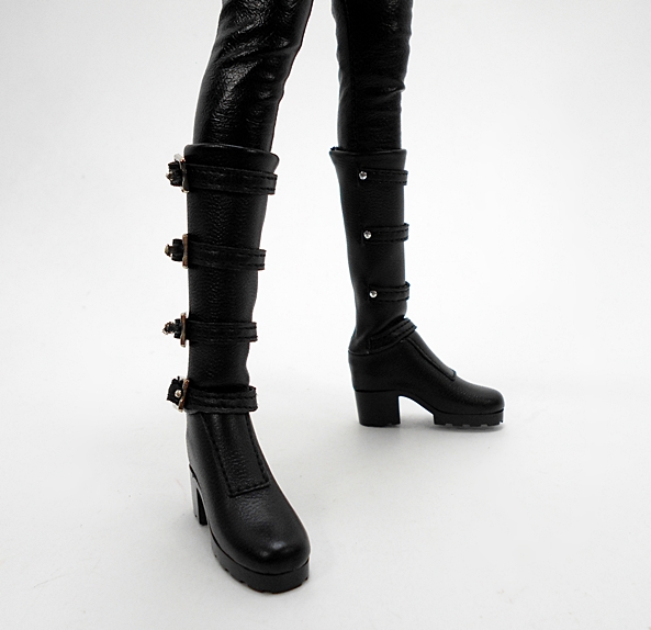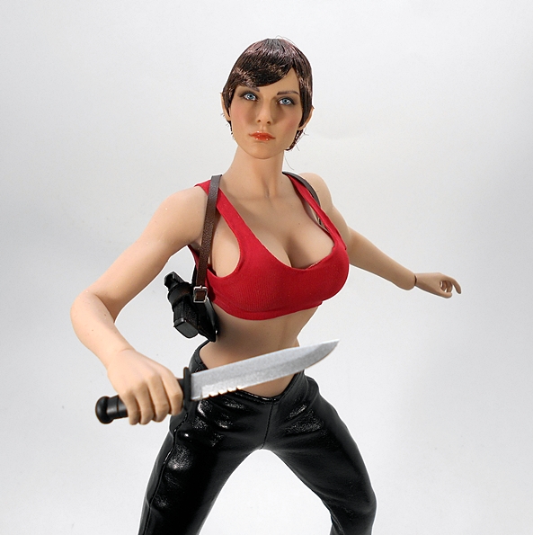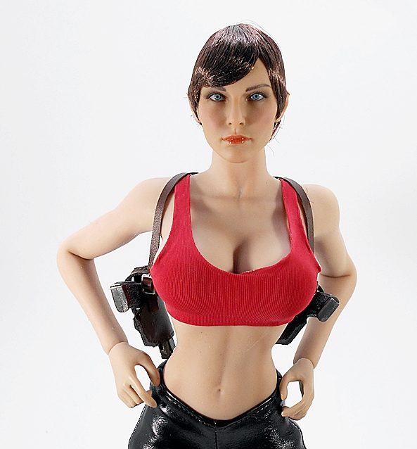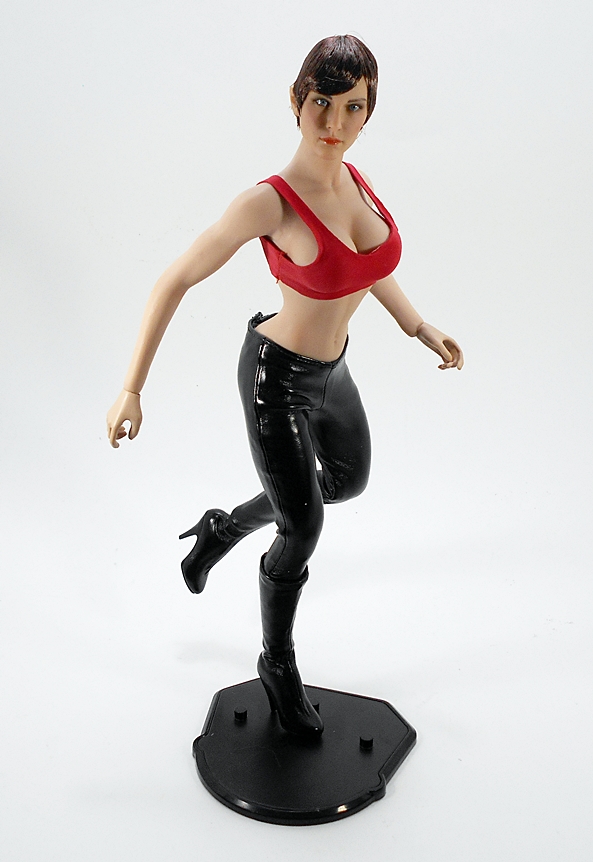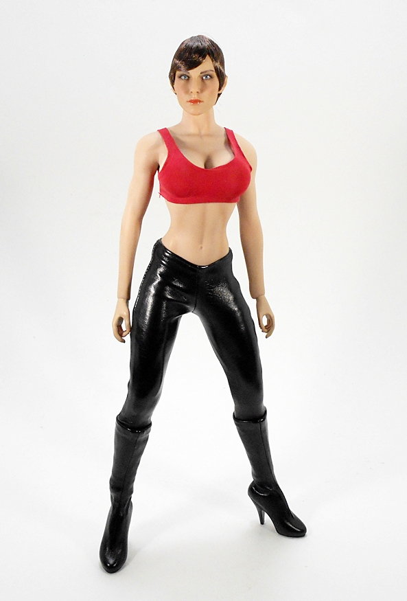 Mercy comes out of the box wearing her skimpy red sports bra, tight leather pants, and high-heeled black boots, all of which fit the figure beautifully. This is a good look for her, because it really showcases the seamless body, at least from the waist up. Granted, there isn’t a whole lot of sophistication and detail in the outfit, but the stitching is neat, and the only hiccup on the whole ensemble is the flap above her butt where the waist is secured. You can see a little empty space inside the boots where her legs connect to the boot feet, but it still looks fine. The pants are also very pliable and don’t offer any resistance when posing the figure.