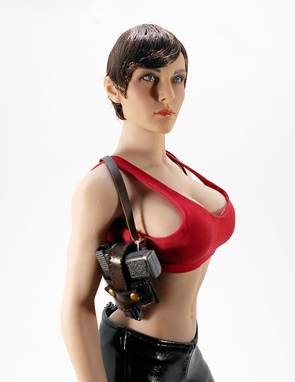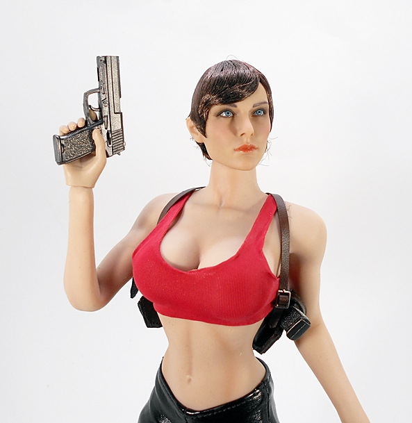 Her guns can be worn on the included shoulder rig. The rig is very easy to get on, but the holsters themselves were backwards, so I had to unbuckle the rig, slide the holsters out and put them back on the right way. This seems to be an error on more than a few of these figures, but not a critical one. It just causes a little bit of work to fix it. The rig fits the figure pretty well, although technically, the guns on a dual rig like this should hang horizontal for easy access.