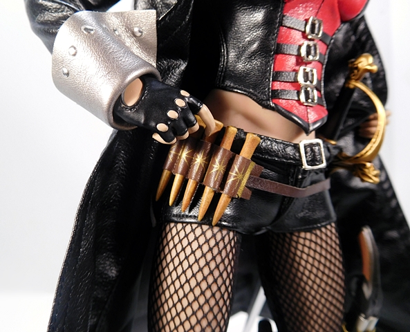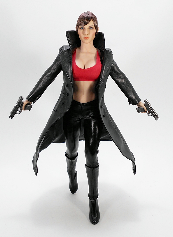 The trench coat! Even though it’s an integral piece of her wardrobe, I saved it for last, as it seems a shame to cover up that beautiful body. Nonetheless, this is probably how I’ll be displaying her most of the time. The material matches her “leather” pants perfectly and it really rounds out her signature look. It also keeps the splattered blood and brains off of her while she’s capping demons throughout the Nine Rings of Hell.